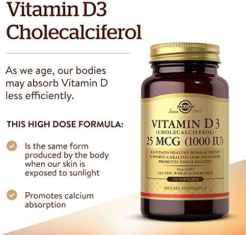 Las cápsulas blandas de vitamina D3 de Solgar, 25 mcg, 1000 UI, ayudan a mantener sanos los huesos, los dientes y el sistema inmunológico, apoyan el sistema inmunológico, no transgénicos, sin gluten, sin lácteos, porciones, sin sabor, 250 unidades