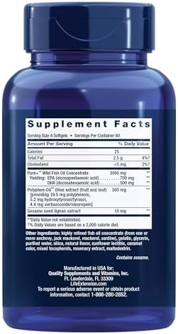 Extensión de Vida Super Omega-3 EPA/DHA Aceite de Pescado, Lignanatos de Sésamo y Extracto de Oliva – Apoyo a la Salud del Corazón, Salud Cerebral, Salud contra la Inflamación, Sin Gluten, Fácil de Tragar, No OGM, 240 Cápsulas Suave
