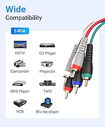 ➤ 5 RCA VIDEO & AUDIO CABLE: BlueRigger YPbPr component audio video cable makes it easy for you to connect your DVD player, VCR, CD player, HDTV and other home theater equipment. ➤ LOSSLESS AV TRANSMISSION: This RCA to RCA cable is built with dual shielding and a pure copper core, ensuring minimal interference and maximum signal strength. Supports resolutions various resolutions 480i, 480p, 720p, and 1080i ➤ DURABILITY: BlueRigger 5 RCA Male to 5 RCA Male has 3RCA connectors for video and 2RCA connectors for audio. Crafted with a sturdy PVC jacket, 24K gold plated connectors and aluminum foil shielding, this composite cable is durable enough to withstand frequent plugging and unplugging ➤ WIDE COMPATIBILITY: This AV cable is compatible with HDTV, DVD player, CD player, camcorder, projector, DVR’s, DVD player, TiVO, VCR and Blu-ray player.The colored plugs helps to identify and install the cords correctly. ➤ WARRANTY: BlueRigger Lifetime Warranty and US-based Customer Support