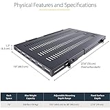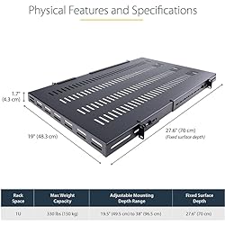 UNIVERSAL 19'' FIT: This vented server rack mount shelf works with 19in 4-post server racks and has a fixed surface depth of 27.56in, and an adjustable mounting depth range of 19.5-38in for your data, networking or other small-form tools / equipment COMPACT DESIGN: The adjustable vented rack shelf features a very compact form factor, making it ideal for non-rackmount equipment, tools and peripherals in your home, studio or office space HEAVY-DUTY & DURABLE DESIGN: Constructed with SPCC commercial cold-rolled steel, the sturdy IT-grade cabinet shelf ensures long term durability and supports a total weight load of 330 lb / 150 kg VERSATILE FUNCTIONALITY: With a surface depth of 27.56in and adjustable mounting depth range of 19.5-38in, this shelf can work with any 19 inch 4-post cabinet or equipment rack - It provides additional storage space for your tools or A/V accessories THE IT PRO'S CHOICE: Designed and built for IT Professionals, this adjustable vented rack shelf is backed for life, including free lifetime 24/5 multi-lingual technical assistance