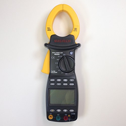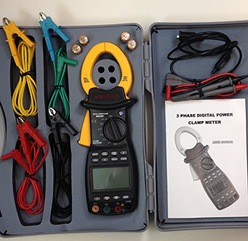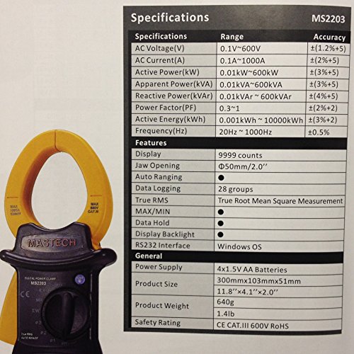 Mastech MS2203 three phase digital power clamp meter specific at ions: - AC voltage (V): 0.1V 600V - AC current (a): 0.1a 1000a - active power (kW): 0.01Kw 600Kw - apparent power (KVA): 0.01Kva 600Kva - reactive power (dvar): 0.01KVAR 600KVAR - power factor (PF): 0.3 1 - active energy (kWh): 0.001Kwh 10000Kwh - frequency (Hz): 20Hz 1000Hz features: - display 9999 Counts - jaw opening φ50mm/2.0" - auto ranging - data logging: 28 groups - true RMS: true root mean square measurement - max/min - data hold - display back light - RS232 interface: Windows OS general: - power supply: 4 x 1.5V AA batteries - product size: 300mm x 103mm x 51mm/11.8" x 4.1 inch x 2.0 inch - product weight: 640G/1.4lb - safety rating: CE, cat iii 600V RoHS