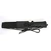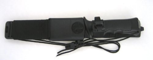 12 3/8 «en total. Hoja de lanza de acero inoxidable con acabado gris mate de 7» con respaldo de sierra de doble corte. Mango negro de aluminio de magnesio ranurado con dedos con protector y orificio de amarre. El pomo de acero inoxidable con acabado gris mate se desenrosca para revelar una brújula dentro de la tapa y un pequeño kit de supervivencia almacenado en un tubo acrílico transparente en el mango. Junta tórica sellada. Agujero para cordón con cordón negro. Funda negra de nailon duro con correas para las piernas. Pequeño compartimento de almacenamiento dentro de la funda para guardar balas. El exterior de la funda cuenta con varios pies de cordón de nailon negro. La parte trasera de la funda cuenta con piedra de afilar