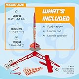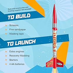 BEGINNER MODEL ROCKET SET: The Estes Flash model-rocket launch set lets kids ages 10+ and hobbyists easily build and blast off our beginner rocket model. This kit includes rocket parts, an engine mount, decals, a recovery parachute, a launch pad system, and instructions. It requires rocket engines, Starters, Recovery Wadding, and 4 high-quality 1.5-volt AA alkaline batteries (sold separately) for launch use. SOARS UP TO 925 FT.: Our Flash rocket features a sleek, drag-defying design and soars in the air up to a projected altitude of 925 ft. (282 m) with a C6-7 Estes engine (sold separately). This small model rocket is also compatible with A8-3, B4-4, B6-4, and C6-5 engines. READY TO ASSEMBLE: Rocket-building kits are creative, educational gift ideas for Christmas or special-occasion surprises! This beginner Flash model rocket kit comes ready to build, assembles in approximately 1 hour, and comes with a Porta-Pad II Launch Pad and an Electron Beam Launch Controller for quick setup. SAFETY FIRST, FUN ALWAYS: Our rockets are designed to be used with the NAR (National Association of Rocketry) model-rocket safety code. Always ensure you have an appropriate launch site, stand back at least 15 ft., insert the safety key, issue a countdown, and then you can let your rocket fly! ESTES EDUCATION: Since 1958, Estes has created educational rocket kits designed for an unforgettable launch experience. As a family-owned, US-based company, we offer exciting and engaging STEM products for all interests, skills, and power levels. Activity set for launching model rocket Drag-resistant design for providing high performance with cloud-base flights over 925.0 feet on standard Estes engine (sold separately) Snap-together, plastic molded fin set with nose cone, attachable pre-colored body tube and die cut, self-stick decals for ease of assembly Launch pad and controller for discharging rocket Measures 16.2"(L)