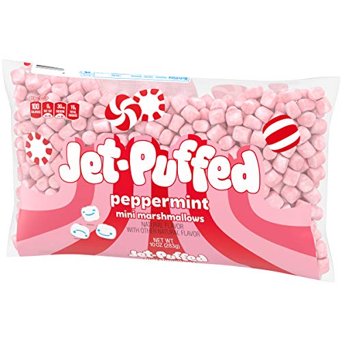 Jet-Puffed Peppermint Mini Marshmallows are a delicious and versatile holiday dessert topping. These miniature marshmallows deliver the sweet taste and fluffy texture you know and love with mouthwatering peppermint flavor. With 0 grams of trans fat and 0 grams of total fat per serving, peppermint flavored marshmallows make a great fat free snack or a fun addition to your favorite marshmallow dessert recipes. Try adding peppermint marshmallows to your hot chocolate to warm up on chilly winter evenings, or enjoy them on their own whenever a craving hits. Perfect for the holidays, these Christmas marshmallows are sure to become a favorite family tradition. These marshmallows come packaged in a sealed 10 ounce bag for lasting freshness until you're ready to enjoy.