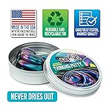 Color-shifting tones of metallic blue, purple, copper, and red Hues change based on angle of light Stretch it, bounce it, pop it, tear it, and sculpt it! Fun for ages 3+ Includes 1/5 lb. (3.2 oz) of Genuine Crazy Aaron’s Thinking Putty Made in the USA from non-toxic silicone and never dries out