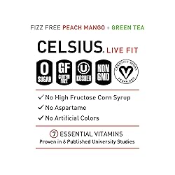 Functional, Essential Energy with 200mg Caffeine to help you LIVE FIT Made with Premium, Proven Ingredients and 7 Essential Vitamins No Sugar, No Sodium No High Fructose Corn Syrup, No Aspartame, No Artificial Flavors or Colors Gluten-Free, Kosher, Non-GMO, & Certified Vegan Non-carbonated CELSIUS Peach Mango Green Tea combines the tropical sweetness of mangos and juicy, vibrant peaches without all the bubbles. Reminiscent of a brisk, refreshing peach iced tea.