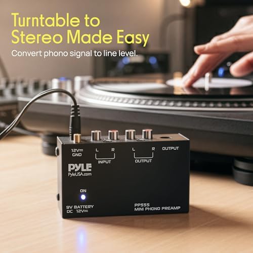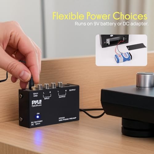 Pyle Phono Turntable Preamp - Mini Stereo Preamplifier with 9V Battery - 12V DC Power Adapter - RCA Input/Output - Low Noise - Ideal for Phonograph and Vinyl - PP555