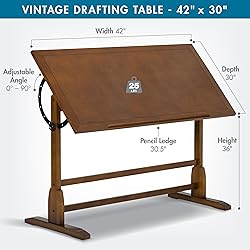 VINTAGE DRAFTING TABLE: Classic, antique design with a rustic finish that is reminiscent of turn-of-the-century furnishings; Perfect for setting up and diving into a variety of creative projects, including painting, drawing, sketching, writing, and more BUILT-IN PENCIL GROOVE AND PENCIL LEDGE: Designed with a 24"-wide pencil groove and pencil ledge for storing writing utensils and canvases; Easily set down pencils, pens, paintbrushes, and more as you work ADJUSTABLE WORK SURFACE: 42" by 30" work surface features a unique platform that adjusts from a flat surface to a 23-, 46-, 70-, and 90-degree angle; Rest of stand is not height adjustable; Transforms workspace and allows for versatility as you create SUSTAINABLE DESIGN: The solid wood frame makes this wood drafting table durable and ready for years of use; Includes four floor levelers for uneven surfaces PERFECT FOR ANY ROOM: Ideal for adding a fashionable touch to a variety of spaces; Use our drafting and writing table in your office, art studio, craft room, and more