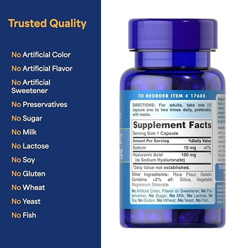 Hyaluronic Acid is a natural component found throughout your body, including your skin, joints, and bones. As we age, our production of Hyaluronic Acid decreases, but these capsules help replenish this vital nutrient. With a focus on skin hydration, our formula supports skin health, promoting a youthful appearance and overall well-being. * Manufactured in the United States with high-quality ingredients from around the world, Puritan's Pride 100 mg Hyaluronic Acid helps you feel your best, inside and out. * *These statements have not been evaluated by the Food and Drug Administration. This product is not intended to diagnose, treat, cure or prevent any disease.