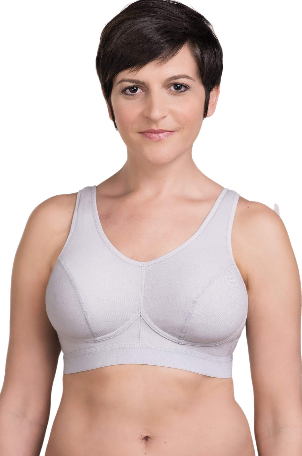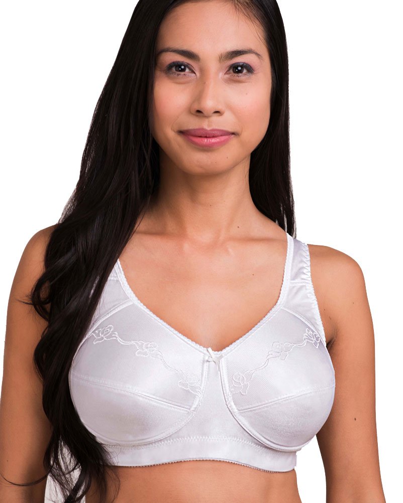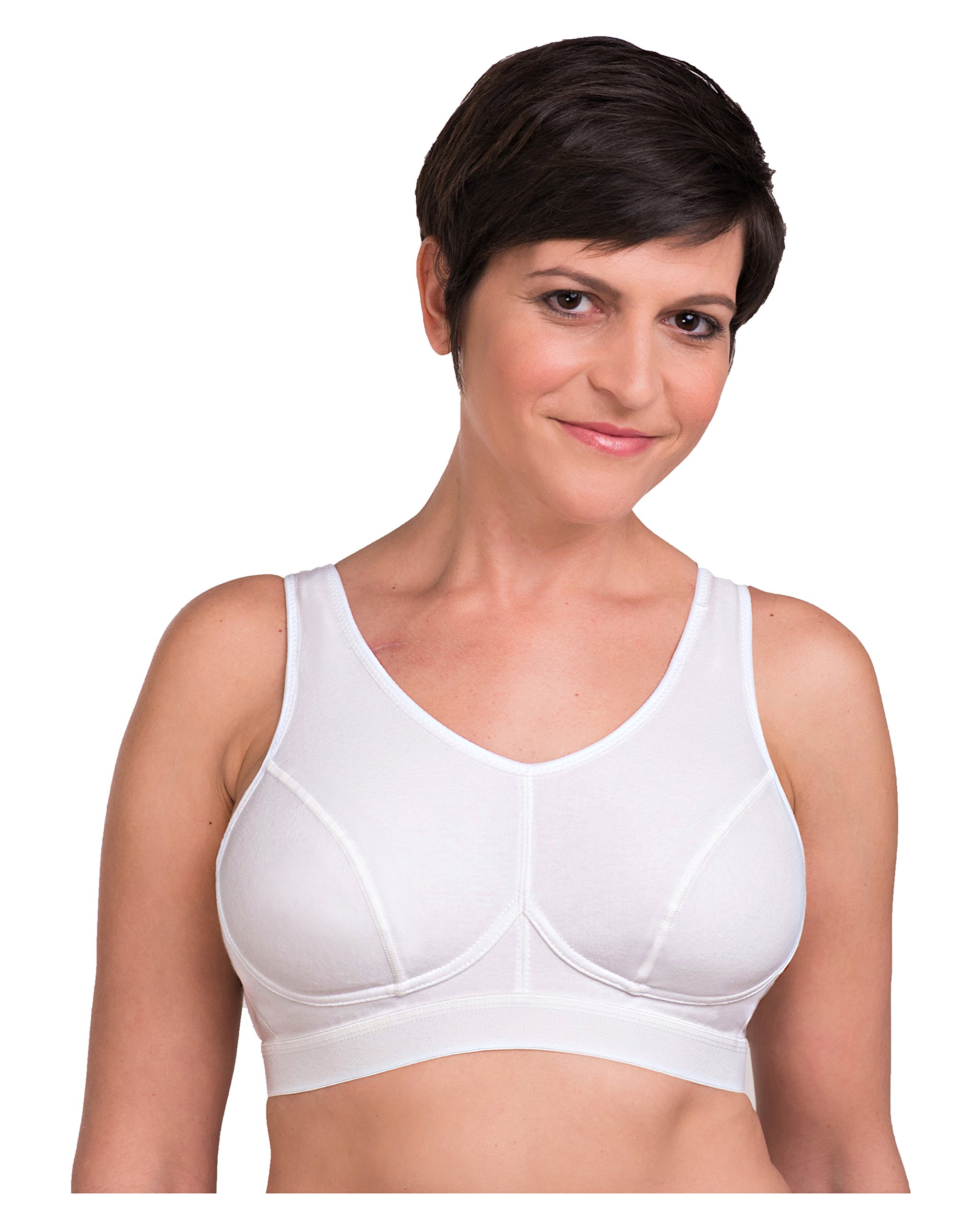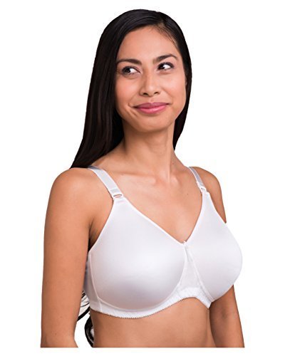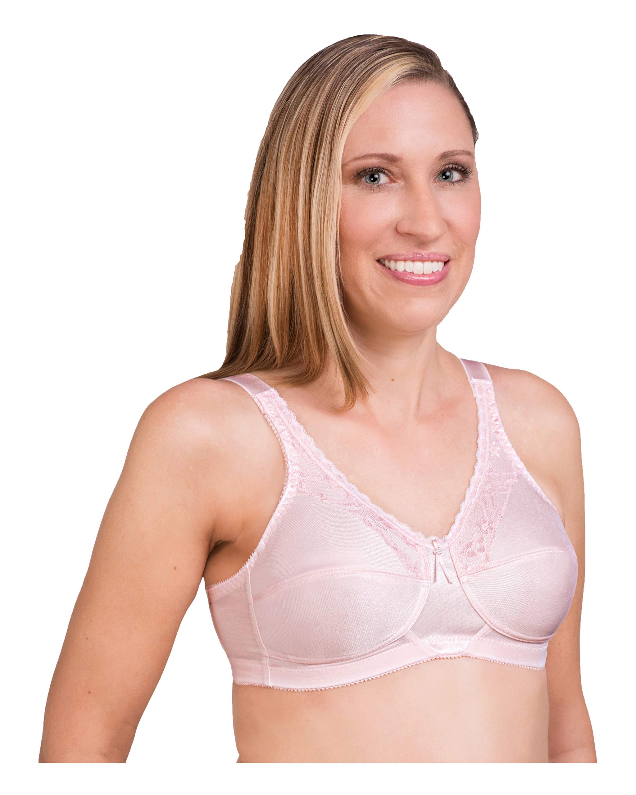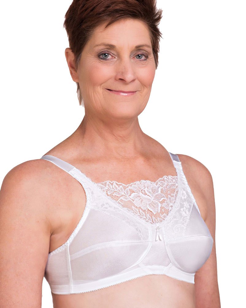 Average shape tailored soft cup is accented with lace overlay and delicate lace neckline. Unlined cups are seamed for an easy fit. Featuring a leotard back design, the supportive elastic straps adjust in the back. Pockets will accommodate most breast forms. Color: White. Sizes: A34-42; B34-44; C34-48; D36-48; DD36-48.