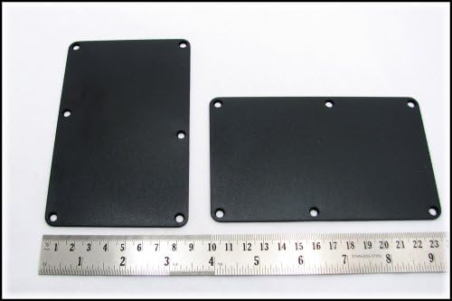 This is a set of two black plastic cover plates, for use in covering wiring cavities and other access holes in electric guitars. They also work great for covering access holes in cigar box guitars! So if, after she's all together and the box is sealed, and then you discover your pickup wire has come loose, you can cut a hole and then use one of these to cover it! The dimensions of these black plastic cover plates are 3 3/8" x 5 1/2" and they are just over 1/16" thick. We include 12 black screws for use in mounting these plates (6 each).