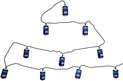 This 10-light Bud Light beer can light set by Kurt Adler is a fun way to add to the lighting of your holiday or party decor. Each of the 10 lights in this novelty light set resembles a can of Bud Light beer. Set features include 30" x 12" green lead wire, 12V 0.08A clear incandescent bulbs, 4 spare bulbs and 1 spare fuse. For both indoor and outdoor use.