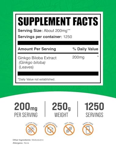 BulkSupplements.com Ginkgo Biloba Extract Powder - from Ginkgo Biloba Leaf, Antioxidant Source, Herbal Supplement - Gluten Free, 200mg per Serving, 250g (8.8 oz) (Pack of 1)