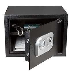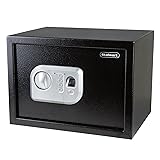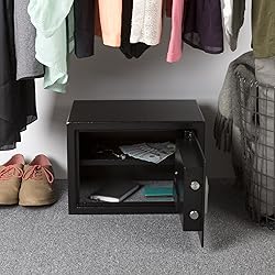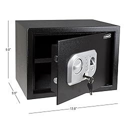 FINGERPRINT SAFE AND LOCK BOX - Ideal for use at home or the office, this personal safe lets you access your valuables by using the programmable keypad or biometric fingerprint scanner. It also comes with 2 keys should you forget your 3 to 8-digit code. EXTRA SECURITY - The biometric reader on this safe box can store up to 32 fingerprints of family and friends you trust to access your items in case of an emergency. The safe is powered by 4AA batteries and sounds an alarm to alert you of possible theft. DURABLE CONSTRUCTION - Made of durable .078-inch thick cold-rolled steel, the money safe has hidden door hinges to prevent unwanted tampering and theft of your money, jewelry, and other important valuables. The safe is small enough to fit in a closet. INCLUDES HARDWARE - This lock box for personal items comes with all the necessary hardware for mounting the safe to either a wall or the floor to deter thieves from easily removing it. The lock box is great for decluttering and organizing work areas. PRODUCT DETAILS - Materials: Cold-Rolled Steel. Dimensions: (L) 13.8" x (W) 9.8" x (H) 9.8"; Interior: (L) 13.6" x (W) 7.3" x (H) 9.68"; Door: (L) 12.2" x (W) 8.3". Includes Mounting Hardware, 2 Override Keys, and 4AA Batteries. Color: Black