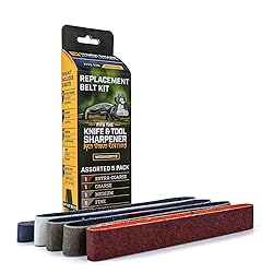Direct replacement abrasive belt assortment for the Ken Onion Edition Work Sharp Knife & Tool Sharpener (WSKTS-KO) only. Includes (1) P120 Extra Coarse (1) X65 Coarse(1) X22 Medium (1) X4 Fine (1) 6000 Extra Fine belts Belts are 3/4" x 12" (except 6000 Micro-Mesh, which is 1/2" x 12") and do not fit any other Work Sharp tools or accessories Belts included: P120 Extra Coarse Grit - 3/4" x 12" X65 Coarse Grit (P220 equivalent) - 3/4" x 12" X22 Medium Grit (P1000 equivalent) - 3/4" x 12" X4 Fine Grit (P3000 equivalent) - 3/4" x 12" 6000 Extra Fine Grit, 1/2" x 12" Premium grade, engineered abrasives are long lasting and designed for knife and tool sharpening and grinding applications. Belts are manufacted in the USA by Norton Abrasives for Work Sharp.