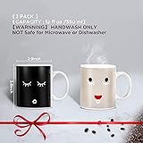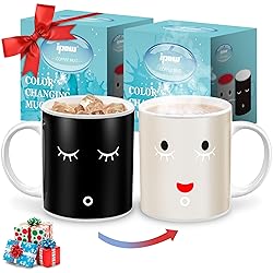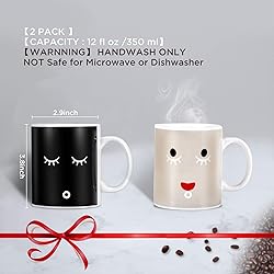 Magic Color Changing, Surprise! - When our mug is empty or filled with cold liquid, it keeps clam with a sleeping cute face, while when you poured with hot liquid of temperature over 70°C/158°F5, it will wake up with a happy smiling face in seconds. Good for Coffee, Tea, Water and all drinks. Funny magic cup, happy daily life. Careful Temperature Remind - Always habitually have a sip of coffee without notice? Oops, found it was cold. Our color changing mug will gradually turn back to black sleeping face when the liquid become cold, which can obviously remind you if it is too cold or too hot to drink. Durable High Quality Ceramic Mug - Our 12 Oz/350 ML heat changing mugs is well made with premium thick ceramic, features smooth edges and applied leading thermo-sensitive material printing technology. All these ensure a long time of use, totally food safe and no smelling. Please be well noticed it is Hand Wash Only. Best Gift Choice with 2 Individual Package - Our 2 Pack color changing coffee mug come with 2 individual nice gift boxes. You can send them as a gift all together or individually. Perfect gift choice for Thanksgiving, Christmas, New Year, Valentine’s Day, Birthday, Father’s Day, Mother’s Day, Teacher’s Day and son on. Purchase with Confidence - We wish you a very happy purchasing from us and to ensure it, we offer worry free service. Any quality issue, please feel free to contact us by e-mail, our customer service is always glad and polite to help you out.
