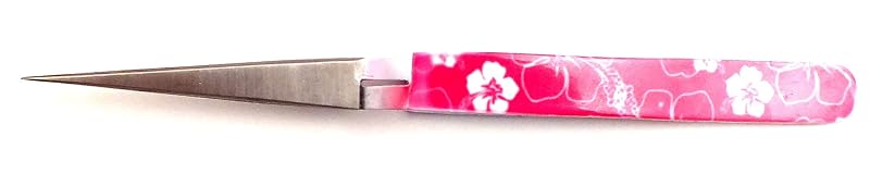 Stainless steel Self opening with cross action design Closes automatically on the tiniest threads The pink floral handle makes tweezers easy to find