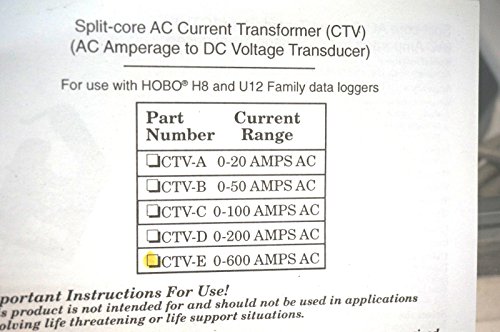 A split-core AC current sensor responsive over the range of 0 to 600 amps AC for use with U12 data loggers with external input channels. With an input current of AC current sine wave single phase 50 Hz or 60 Hz load power factor 0.5 to 1.0 lead or lag. This sensor is not designed for use with intrinsically-safe (IS) loggers; the molded-plastic housing is rated for indoor use per UL508 with removable leg.
