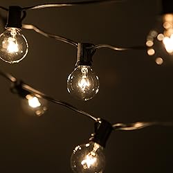 - Our high quality outdoor string lights beautifully transform your space and create the perfect ambiance for you to enjoy all year long. Perfect for weddings, events, parties and home decor, your sting lights will be the highlight in any setting. Set the mood with us! Specifications: Set includes a BLACK 100 Foot C7 Base light string and 100 G40 5 watt CLEAR glass light bulbs Light strands have sockets spaced every 12 inches, If one bulb burns out the rest stay lit Our G40, 5 Watt C7 (E12) nickle base light bulbs are 1.6” wide by 1.6” tall Heavy Duty 18 gauge SPT-1W outdoor wire (959 watts max) Manufactured with high quality UL tested wire, plugs and sockets. Long life 3,000 hour light bulbs Length of wire from plug to first light bulb is 6 inches, Indoor and outdoor use Set also includes spare bulbs and spare fuses Genuine Hometown Evolution, Inc. Product