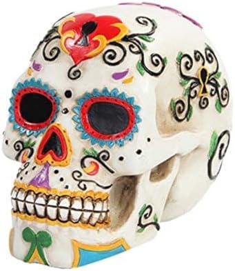 Bring the vibrant spirit of Dia de Los Muertos into your home with this stunning 6-inch white sugar skull figurine. Meticulously crafted from durable polyresin, this decorative piece showcases intricate traditional designs with swirling patterns and floral motifs hand-painted in vivid colors. The skull features striking blue-rimmed eye sockets with red borders, ornate dental details, and delicate embellishments including green, purple, and yellow accents throughout. Perfect as a Halloween decoration or year-round gothic home decor, this sugar skull captures the artistic essence of Day of the Dead celebrations. The detailed craftsmanship makes it an eye-catching addition to any altar display or collectible arrangement. Each figurine serves as a beautiful representation of this important cultural tradition while adding a unique decorative touch to your space. The polyresin construction ensures durability while maintaining the intricate details of the design.