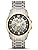 - Caja de acero inoxidable chapada en plata y oro con esfera exterior texturizada; la esfera en forma de esqueleto revela el funcionamiento interno de este reloj automático Brazalete de acero inoxidable