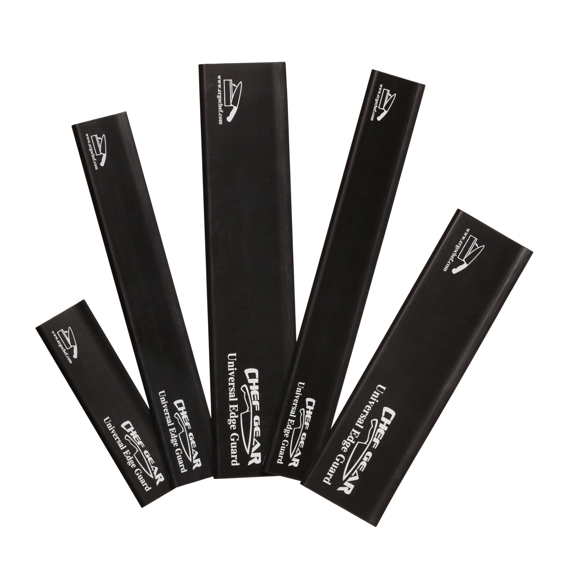 - The universal edge guard set by ergo chef includes 2 wide-blade and 3 narrow-blade guards to make a set of 5. The guards protect the edges of your knives - and your fingers, too! store and transport knives safely without damaging or dulling their blade edge. The bright colors help identify knives easily in a drawer or in a knife roll. The guards work on all stamped, forged, and ceramic knives. To clean, wipe with a clean, damp cloth. Set includes 5 different sizes and colors: 1 by 4.2-inch Pink (paring knife), 1 by 7.5-inch Red (Utility knife or santoku) , 1 by 8-inch orange (Carving or bread knife), 1.5 by 8-inch blue (chef knife), and 1.5 by 6-inch green (chef or santoku). By Ergo Chef.
