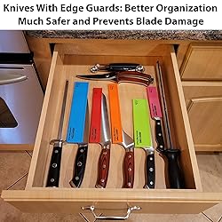Store and transport knives safely without damaging or dulling their blade edge; protects the edges of your knives and your fingers, too. The set includes 5 different sizes and colors: 1 x 4.2-inch Pink (paring knife), 1 x 7.5-inch Red (Utility knife or santoku),1 x 8-inch orange (Carving or bread knife), 1.5 x 8-inch blue (chef knife), and 1.5 x 6-inch green (chef or santoku) Designed for safe, drawer storage and transportation in knife bags and cases, Flared top has a wider opening so you can safely insert your knife blade into the guard. Flared top has a wider opening so you can safely insert your knife blade into the guard. Works on all stamped, forged, and ceramic knives; to clean wipe with damp cloth.