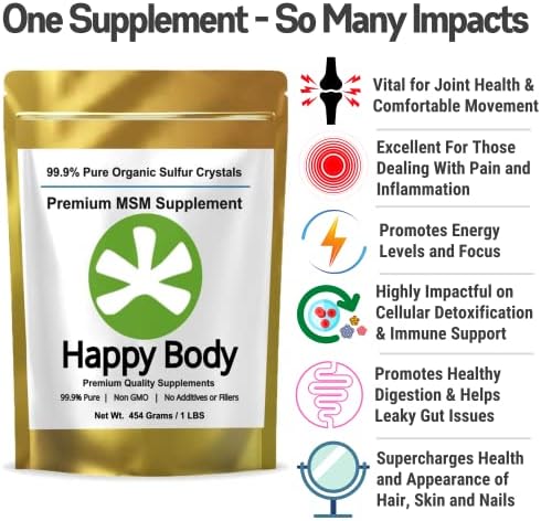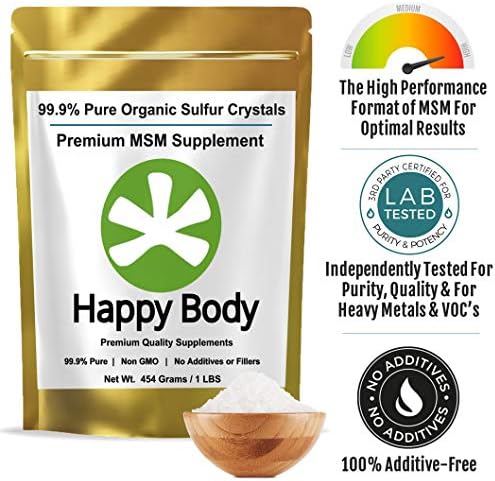 - PREMIUM QUALITY: Organic Sulfur Crystals from Happy Body. The ultimate format of MSM that’s a minimum of 99.9% pure and 100% free of additives. It’s the optimal form of MSM, well known for its unmatched absorption, impacts, and value.