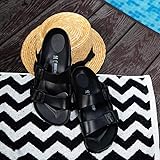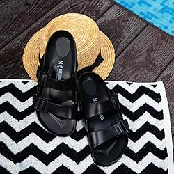 Fabric: EVA Rubber sole Pool slides, Molded footbed, Buckle straps, Regular fit The legendary two-strap design from BIRKENSTOCK - the Arizona; Modeled on the cork original, this sandal is made from ultra lightweight and highly flexible EVA; These sandals are shock absorbing, waterproof, and skin-friendly; Wear them at the beach, in the garden, or around the gym and after workouts; It's the perfect addition to your classic BIRKENSTOCK sandals