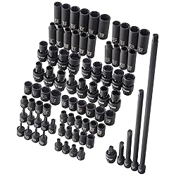 - Sunex 3580, 3/8 Inch Drive Master Impact Socket Set, 80 Pieces, SAE/Metric, 5/16 Inch - 3/4 Inch, 8mm to 19mm, Standard/Deep/Universal, Cr-Mo Steel, Radius Corner Design, Chamfered Opening, Dual Size Markings, Heavy Duty Storage Case, Meets ANSI Standards, Includes Star and Inverted Star Sockets, 4 Extensions, Universal Joint.SET INCLUDES: SAE: (8) Standard Sockets: 5/16”, 3/8”, 7/16”, 1/2”, 9/16”, 5/8”, 11/16”, 3/4” (6) Deep Sockets: 5/16”, 3/8”, 7/16”, 1/2”, 9/16”, 5/8” (9) Universal Sockets: 11/16”, 3/4”, 3/8”, 7/16”, 1/2”, 9/16”, 5/8”, 11/16”, 3/4” METRIC: (12) Standard Sockets: 8mm, 9mm, 10mm, 11mm, 12mm, 13mm, 14mm, 15mm, 16mm, 17mm, 18mm, 19mm (12) Deep Sockets: 8mm, 9mm, 10mm, 11mm, 12mm, 13mm, 14mm, 15mm, 16mm, 17mm, 18mm, 19mm (10) Universal Sockets: 10mm, 11mm, 12mm, 13mm, 14mm, 15mm, 16mm, 17mm, 18mm, 19mm OTHERS: (9) Inverted Star Sockets: E5, E6, E7, E8, E10, E11, E12, E14, E16 (9) Star Sockets: T20, T25, T27, T30, T40, T45, T47, T50, T55 (1) Universal Joint