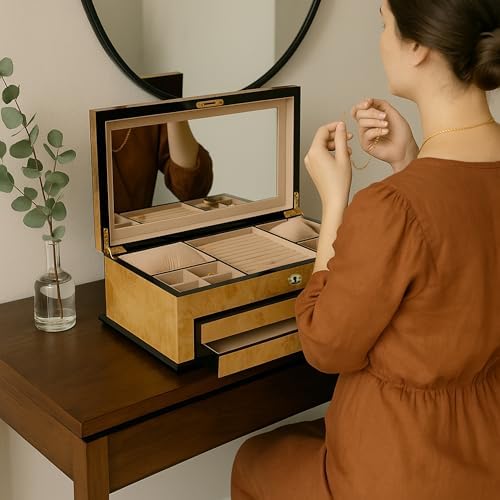 This elegant lacquered "Birdseye Maple" wood jewelry chest offers a stylish solution for organizing your jewelry accessories collection. Featuring three levels including a top tray and two spacious storage drawers, it provides dedicated spaces for rings, bracelets, watches, and more. The soft velour lining cushions delicate pieces, while the mirror under the lid adds convenience. A gold latch closure adds a sophisticated touch, making it perfect for bedroom decor or as a thoughtful gift for jewelry lovers. Functional yet decorative, this jewelry organizer blends beauty with practicality.
