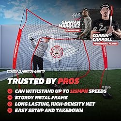 RED 7 X 7 FT BASEBALL NET: This 7x7 foot practice net is a portable solution for baseball and softball training. The net holds multiple buckets of balls, allowing continuous training. The sturdy bow-style frame provides 49 sq. ft. of hitting surface. Includes ground stakes and a heavy-duty carry bag with a shoulder strap EASY QUICK SETUP: The PowerNet batting net offers easy assembly, allowing for fast setup. The net can be set up in under 2 minutes without any tools and includes ground stakes for added stability ULTRA PORTABLE: The collapsible training nets assemble quickly and easily for easy setup anywhere. The lightweight design makes for easy placement during practice sessions. The hitting net breaks down to fit in the carrying bag for easy long-term storage and transport in any vehicle DURABLE: Our 7 by 7 baseball nets for batting are designed to take the abuse of the hardest hits and throws. The steel frame and flexible fiberglass bow poles provide a steady base for our knotless polyester net TRAIN ANYWHERE: Ideal for both outdoor and indoor use, this collapsible training net is perfect for hitting, pitching, batting, and fielding practice. It also functions as a portable backstop, providing a large coverage area for added protection during training sessions
