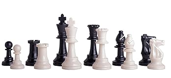 - The Deluxe Chess Set Combination includes one (each) of the following items... Triple Weighted Regulation Plastic Chess Pieces Traditional Staunton pattern.3.75" king with 1.5" base diameter.Complete set of 34 pieces - Includes two additional queens for pawn promotion!Manufactured out of plastic and is virtually indestructible.Triple weighted for improved stability and performance. Vinyl Tournament Chessboard (2.25" Squares) Features rank and file labels on all for sides - ideal for beginners!Manufactured out of high-grade vinyl and will resist dirt, tearing and spillsRolls up into a tight tube-shape for easy transport Deluxe Chess Bag 24" x 9" in size.Designed to hold all chess equipment, including clock, scorebook and 2 pencils.Features two zippered compartments to comfortably store the chess pieces.Has two internal loops to hold rolled up chessboard for easy transport.Removable shoulder strap and two nylon handles.Can hold ANY Chess Clock - including the Chronos! Since 1939, The United States Chess Federation is the official, non-profit US membership organization for chess players and chess supporters of all ages and strengths, from beginners to Grandmasters. The USCF represents the United States in the World Chess Federation (FIDE), linking US members to chess players around the world. To address the equipment needs of Chess players, The US Chess Federation is proud to offer our exclusive line of Chess equipment that is available at reasonable prices. All purchases support the United States Chess Federation and its mission to promote the game of Chess