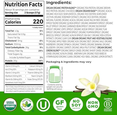 Orgain Organic Vegan Meal Replacement Protein Powder, Vanilla Bean - 20g Plant Based Protein, Gluten Free, Dairy Free, Lactose Free, Soy Free, No Sugar Added, For Smoothies & Shakes - 2.03lb
