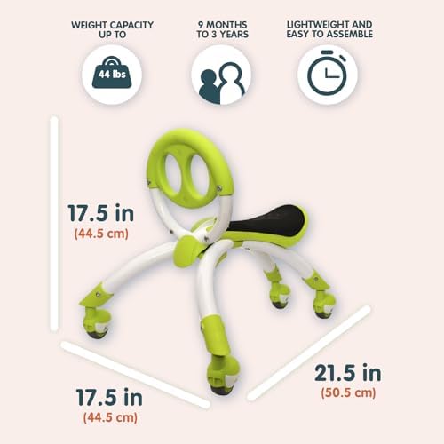 - SPECIFICS: Color: Green. Suitable for children ages 9 months to 3 years with a max weight of 44 lbs. Item overall dimensions: 21.6 L x 17.5 W x 17.3 H inches. Item weight: 3.8 lbs. Assembly required.