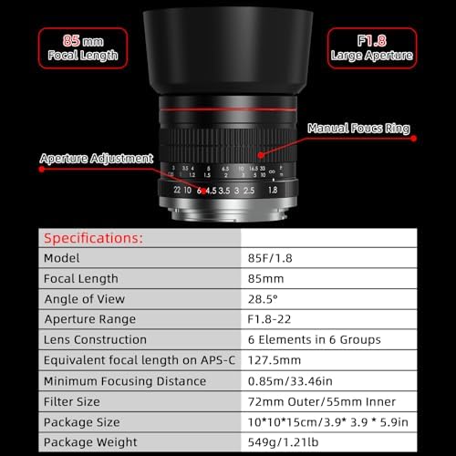 - [Soporte posventa profesional] - Proporcionamos un servicio posventa integral, incluyendo mantenimiento y reemplazo del lente durante el período de garantía, para que pueda usar el lente de retrato de enfoque manual 85mm F1.8. Si tiene alguna pregunta, no dude en contactarnos, le proporcionaremos un servicio amable dentro de las 24 horas.