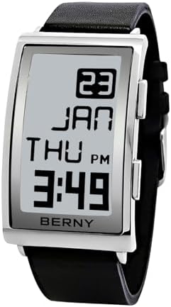 BERNY Men's Digital Sports Watch E-Ink Display Fashion LED E-Paper Watch Curved Dial Leather Band Watches with Two-time Zone Waterproof Wristwatches