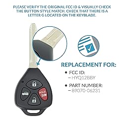 This listing is for 2 brand new replacement remote head key fobs with uncut key blade for select Toyota Avalon and Corolla vehicles. 2011 Toyota Camry Your current key must have a "G" stamped on the blade, if it doesn't then this key will NOT work for you. This remote key must be cut and programmed by a qualified locksmith or dealership in order to function. Replacement for part numbers: HYQ12BBY, 89070-06232 New complete working remote key with all electronics and batteries included plus FREE tech support. Every single remote is tested before it is sent to make sure it is transmitting.