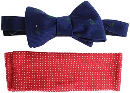 A pine tree print bow tie that comes with a coordinating tiny polka dot print pocket square.