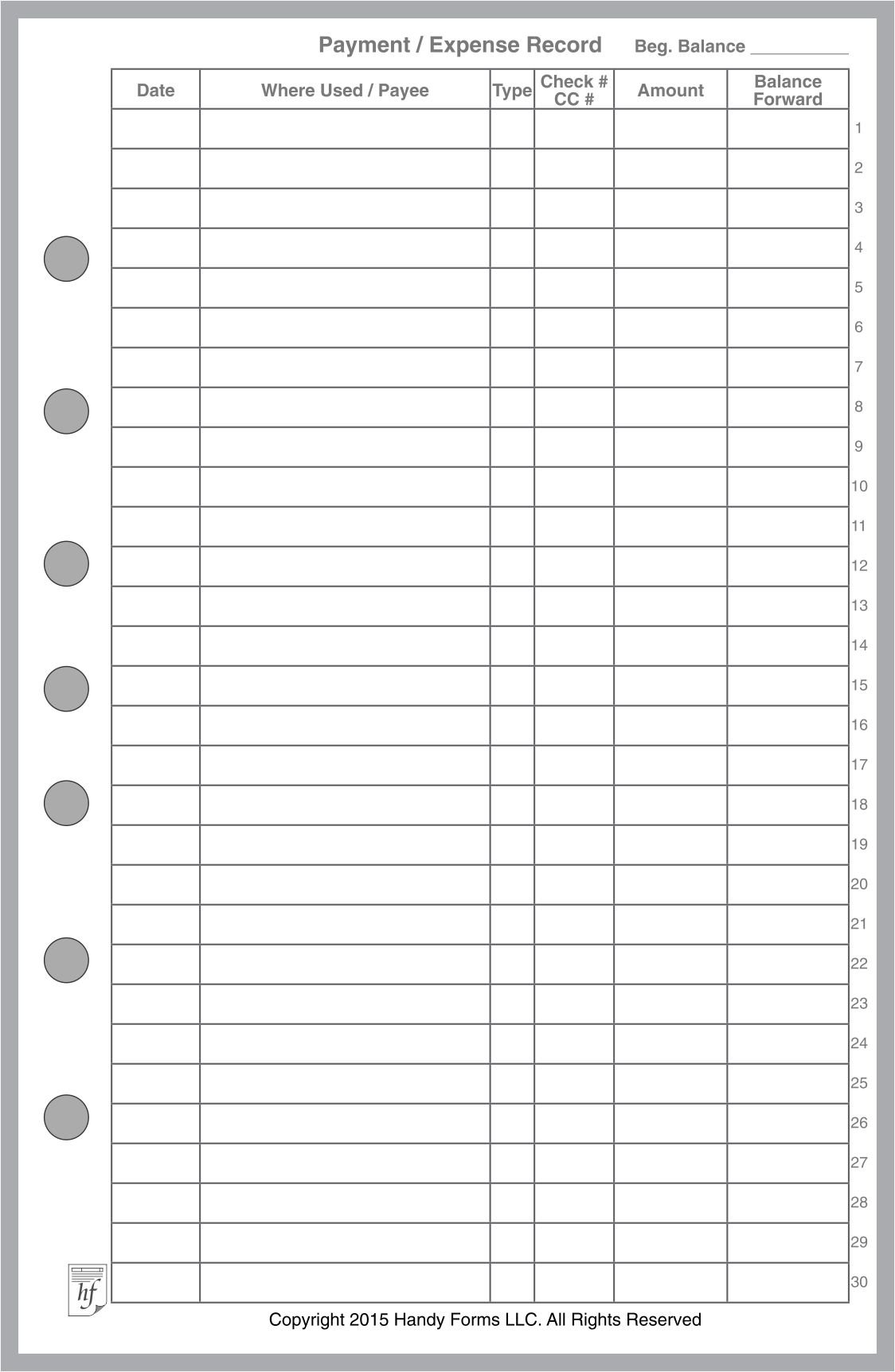 - Record date, payee, type of payment (check, credit card, debit card, cash), check#/credit card #, amount paid, balance forward, and additional information
