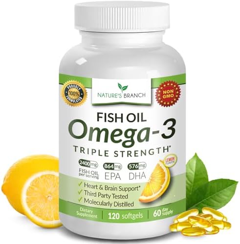 Mejores Pastillas de Aceite de Pescado Omega 3 de Triple Fuerza 2400mg | 120 Cápsulas | Sabor Limón sin Burbujeo de Alta Potencia | 864mg EPA 576mg DHA Cápsulas Suave Ultra Puras | Suplemento para la Salud del Cerebro, Articulación, Ojos, Cabello y Corazón