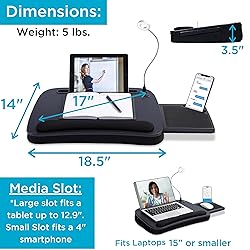 - The Sofia + Sam Lap Desk offers a spacious multi-purpose work surface, accommodating laptops up to 15", tablets, and smartphones, ideal for artists, students, and professionals. Designed with an ergonomic memory foam cushion, wrist rest, and handle, it provides comfort and support for extended use, reducing strain and enhancing posture. This lap desk features an integrated slide-out mouse pad and smartphone slot with a charging hole, ideal for precision tasks and accessibility. Its foldable and portable design allows for easy storage and versatility, making it suitable for use on the couch, bed, or desk. Optimized for remote work and study, it transforms any space into a productive workstation, supporting telecommuting and e-learning.
