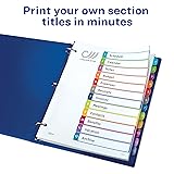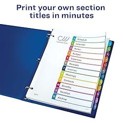 Easy Customization: Use Avery Design & Print and the available templates and tools to personalize your page dividers for 3 ring binder with tabs Durable And Tear-Resistant: Durable holes and tab reinforcements allow your binder tab dividers to withstand frequent handling without tearing Versatile Orientation: Flexible design lets you use notebook dividers with tabs for 3 ring binder in either portrait or landscape mode Bright And Organized: These vibrant notebook dividers with tabs for 3 ring binder feature preprinted numbers, keeping your dividers with tabs organized and visually appealing Printer Compatibility: The table of contents sheet is compatible with laser and inkjet printers, simplifying the printing of section titles