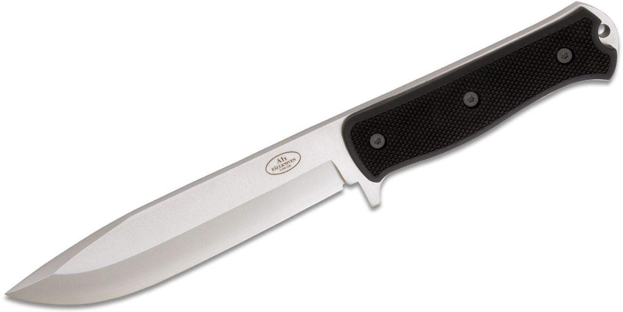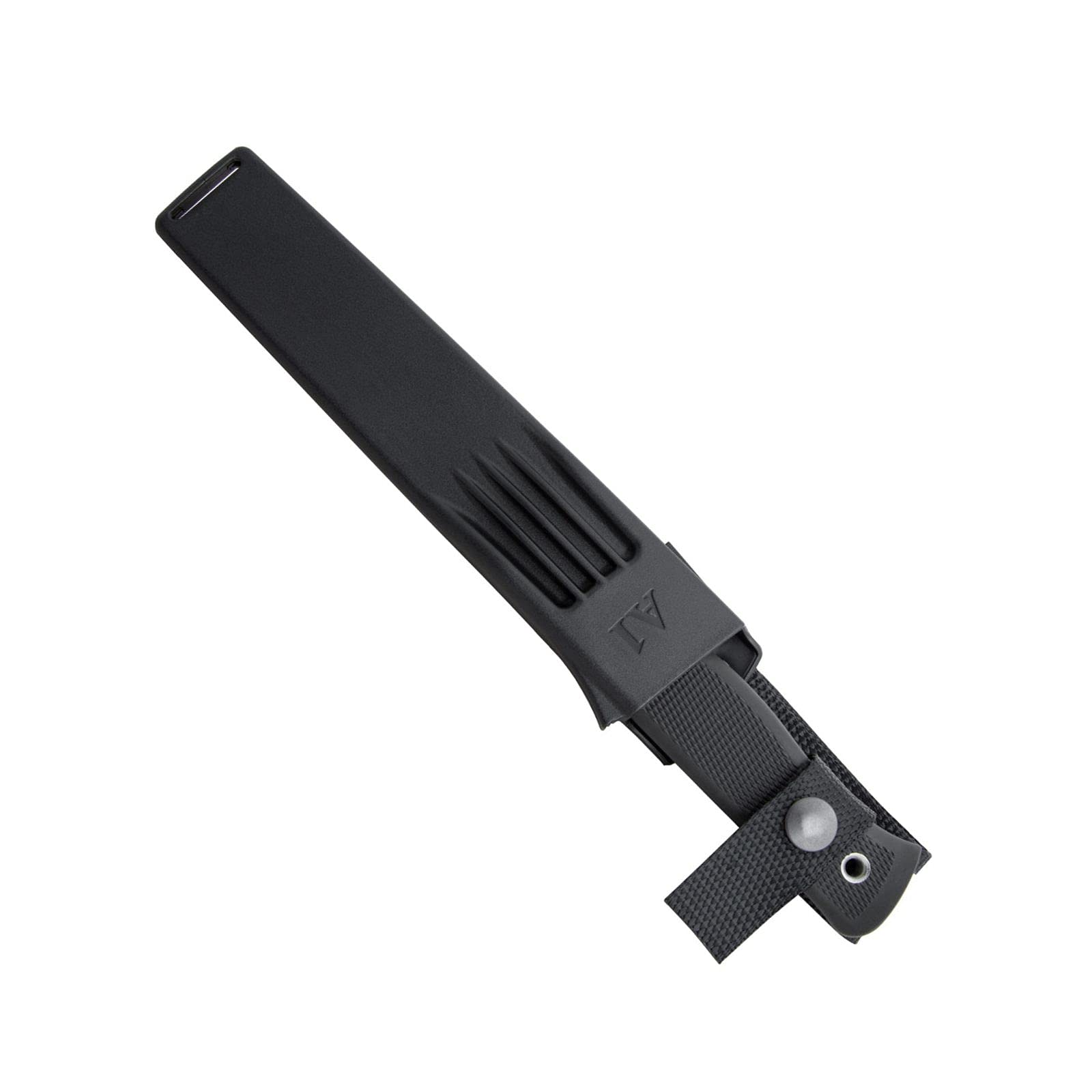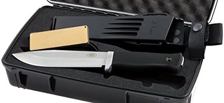 11" Overall. 6.25" Satin finish laminate cobalt steel drop point blade. Black textured Kraton handle. Full tang. Lanyard hole. DC4 whetstone with leather pouch. Black Zytel belt sheath. Storage case.