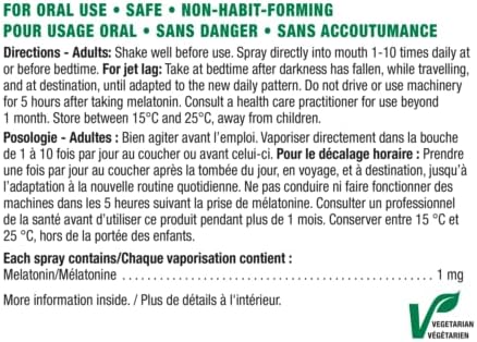 Helps to improve quality of sleep and increase total sleep time Helps relieve daytime fatigue associated with jet lag Helps to reduce the time it takes to fall asleep and reset the body's sleep-wake cycle Free from artificial colours and flavours Delicious, easy to use and travel friendly Jamieson melatonin sleep spray delivers 1 mg of melatonin in just one second to help increase sleep time and correct disturbances associated with air travel ("es;jet lag"es;). This delicious and convenient spray is the perfect option for those who have difficulty swallowing capsules or tablets and fits perfectly in your carry on.