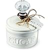 Ceramic sugar bowl with removable lid from Mud Pie features vintage-inspired glass Door Knob handle. Bowl measures 2. 5" X 4" Diameter, lid is 3" X 4. 5" Diameter.