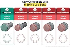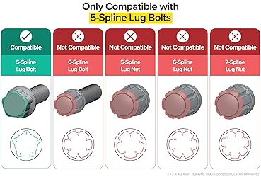 - Upgrade your wheel tool kit with a precision-engineered 5-Spline Socket Key designed for reliable performance and exact fit. This socket key is specially crafted to engage 5-spline wheel bolts, making it an essential tool for removing or installing spline lug bolts. Whether you’re a professional mechanic, dedicated car enthusiast, or simply maintaining your own ride, this tool delivers dependable strength and precision when you need it most. This 5 spline tuner key only removes and replaces 5-sided spline lug bolts. The spline key adapter only fits lug bolts with head diameters measuring 18.5mm (center groove to opposite wall) and 10.8mm (between adjacent center grooves). [ Durability ] Made from robust, corrosion-resistant alloy steel, the 5-spline socket key withstands repeated use and delivers long-lasting durability. Its exact-fit design ensures a secure grip on the splined surfaces of applicable lug bolts — helping reduce slippage and protect your wheels from damage. Compact and easy to store, this socket key is the perfect backup or replacement for lost or worn spline keys. [ Measurement Details ] The head diameter of your 5 spline lug bolt must be at least 18mm to ensure compatibility and a secure fit. [ Important Notes ] This key is intended only for 5-spline lug bolts and is not compatible with lug nuts of any kind (standard hex or spline). Always verify that your vehicle’s wheel hardware matches spline-type bolts using the images provided before use.