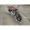 The Garage Dolly rides on sturdy 4-inch wheels, so it will roll or swivel easily, and will even navigate cracks, crevices, and pitted garage floors. The Dolly is made from sturdy aluminum and steel and only weighs 68 lb. When not in use, it folds and can be mounted on a garage wall for storage. The Garage Dolly has a load rating of 1300 lbs. It measures 90″ long (expandable to 94″) and has a deck dimension of 12″ wide. It is 24″ at its widest point at the wheel brackets. Four large twist-down brakes, (along with having the wheels down as well) secure the unit from rolling when placing your bike into the Dolly, or removing it.