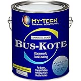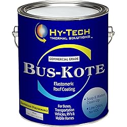 - Bus Kote is a high-build, 100% acrylic, elastomeric roof coating, which is UV and weather resistant and is fortified with Hy-Tech’s ThermaCels. Bus Kote, with its bright white formula, is designed to insulate, seal, waterproof, soundproof and protect with a thick rubber-like, ceramic reinforced shield that expands and contracts with varying temperatures, as well as resisting thermal shock. Bus Kote was originally designed as an insulating, reflective coating for school districts to use on the roofs of school buses to lower the interior temperature. This energy saving coating will reduce interior temperatures when hot due to Hy-Tech’s ThermaCels. Formulated to resist over 100 m.p.h. wind driven rains, the coating resists damage by hail and rain, and insulates against noise and their corrosive effects. Surface Preparation: Surfaces must be clean and free of dirt, grease, excess chalk, loose or scaling paint. Paint will not stick to a chalky surface. Glossy surfaces need to be dulled by sanding. If taping off areas be sure to remove tape with each coat while the paint is still wet. Primer: Aluminum and galvanized metal, fiberglass, rubber and pre-painted surfaces: Aqua Prime #15 Rusted metal: Clean, wire brush and apply one coat of rust converter followed by one coat #18 Metal Prime or #15 Aqua Prime. Joints, Seams and Cracks: Apply one coat of Hy-Tech Elasto-Patch, elastomeric patching compound to all horizontal or vertical seams. Application: Stir thoroughly before use. Apply 2 full generous coats by brush, roller or spray gun. Roller: ¾”-1-1/2” nap depending on surface texture. Spray: Remove all filters, use a tip size of .024-.035 First coat should be allowed to dry overnight before applying the second coat. Do not thin or add other paints or solvents. KEEP FROM FREEZING Do not apply when temperatures are below 50°F. Coatings should only be applied when ventilation is adequate.