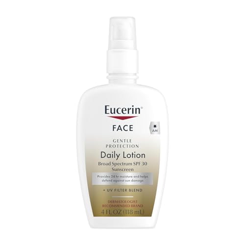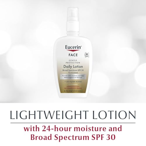 Eucerin Daily Protection Face Lotion SPF 30, 4 oz, is a lightweight facial moisturizer formulated with broad-spectrum sun protection. Designed for daily use, it combines moisturizing ingredients with SPF 30 to help shield skin from harmful UVA and UVB rays. The non-comedogenic formula absorbs quickly and is suitable for use under makeup or alone. Packaged in a convenient 4 oz pump bottle, it supports a consistent skincare routine for those seeking hydration with added sun defense. NDC Code: 10356‑323‑11.